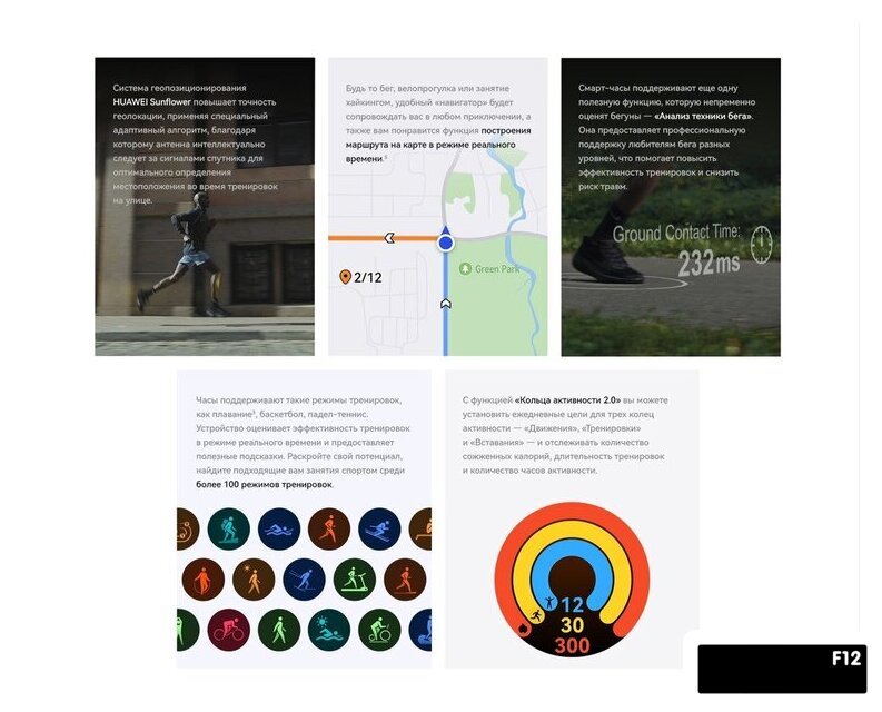 | Спортивные профили | силовые тренировки, кардио тренировки, ходьба, гребля, йога, бег, велоспорт, плавание, сноубординг, игровые виды спорта, боевые искусства, катание на лыжах, гольф |