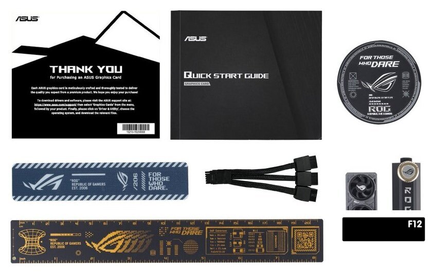 | Комплект поставки | 1 x Speedsetup Manual1 x ROG Graphics Card Holder1 x ROG Velcro Hook & Loop1 x ROG Magnet1 x ROG Graphics Card Keycap1 x ROG PCB Ruler1 x Thank You Card1 x Adapter Cable (1 to 3) |